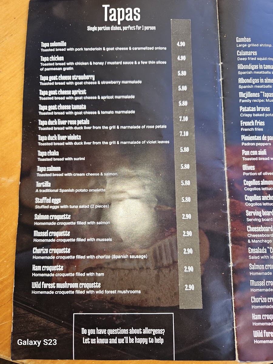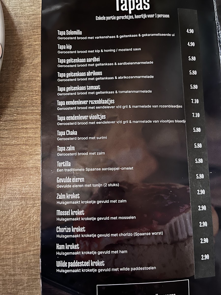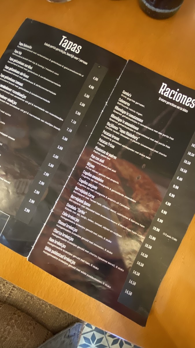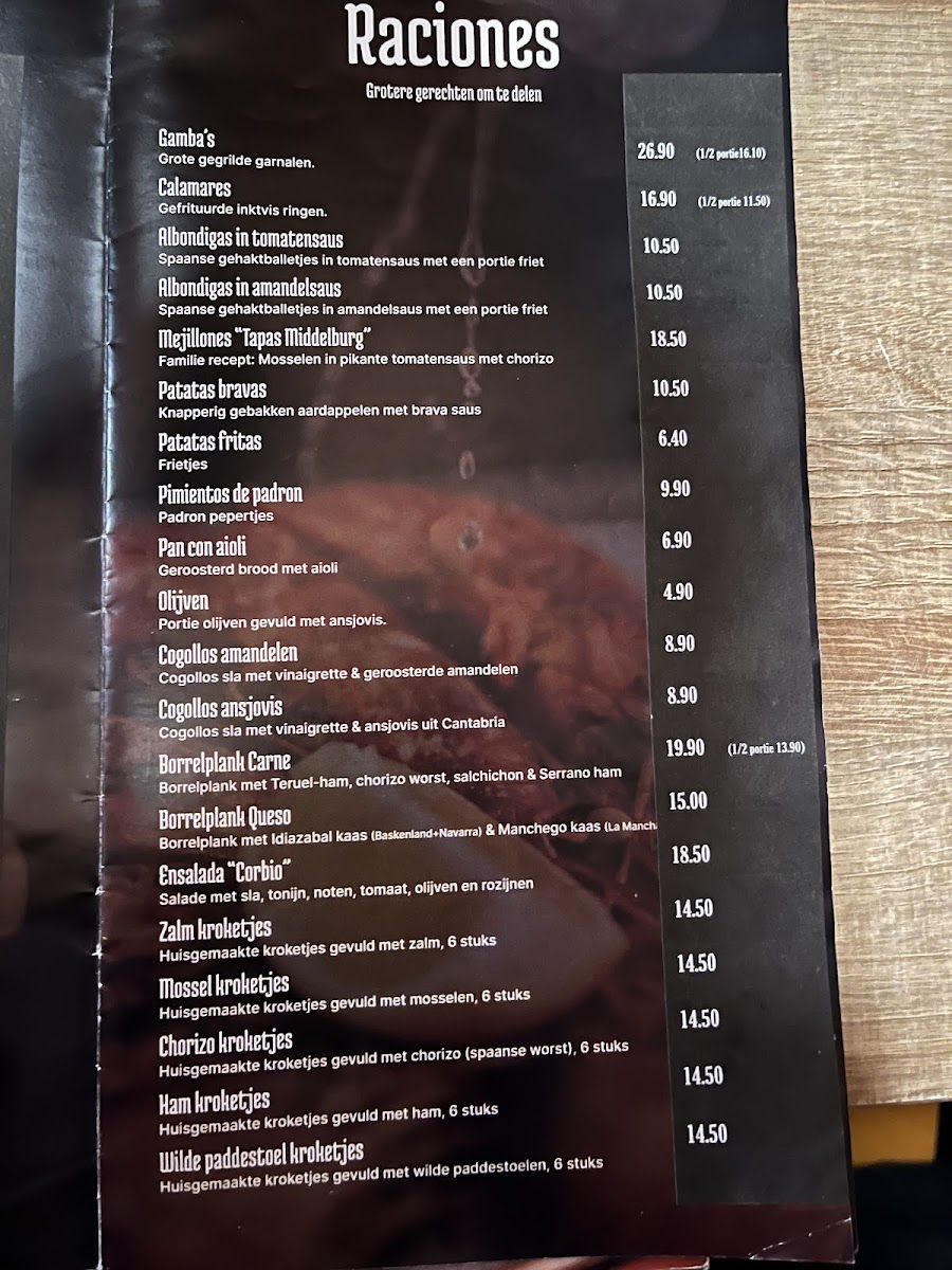 From a reviewer’s perspective, the menu at Tapas Middelburg offers a concise but appealing selection of classic Spanish dishes, with the tapas selection featuring favorites like Croqueta de jamon, Croqueta de chorizo picante, Croqueta de salmon, Croqueta de mejillones, and Tortilla Espanola, all presented as single-portion bites ideal for sampling different flavors. The sharing plates, or raciones, include well-known dishes such as Gambas a la plancha, Gambas a la plancha (1/2 racion), Calamares, Calamares (medio racion), and Patatas Bravas, making it easy for groups to mix and match. For younger guests, the menu also includes Pechugas de pollo con porcion de patats fritas, which provides a simple and familiar option. To finish, the dessert selection highlights traditional sweets like Flan con nata, Creme Catalane, Arroz con leche, and Helados de Valencia, rounding out the menu with authentic Spanish flavors. Overall, the menu focuses on recognizable Spanish classics, offering a balanced variety of tapas, shared dishes, and desserts that together create a complete and satisfying dining experience.